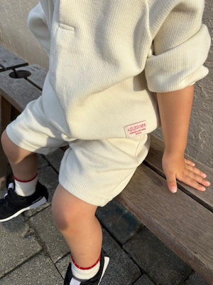 丈は膝の少し上くらいのバミューダ丈で、